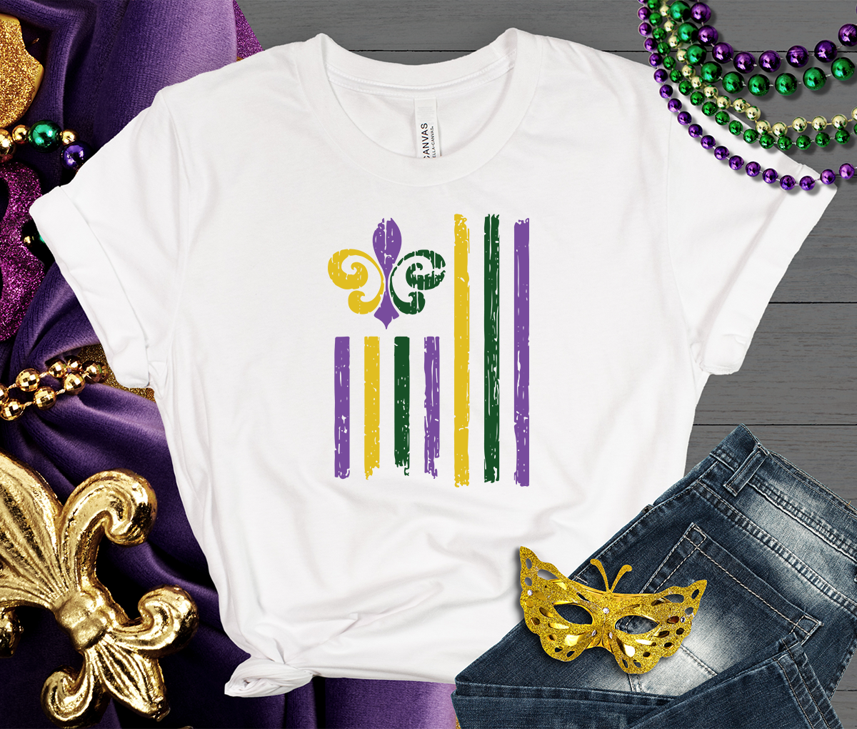 Bring the party with you wherever you go with this simple and fun distressed Mardi Gras Flag tee. Its fleur de lis design celebrates the carnival spirit while adding a touch of quirky style to your wardrobe. Perfect for any Mardi Gras lover!